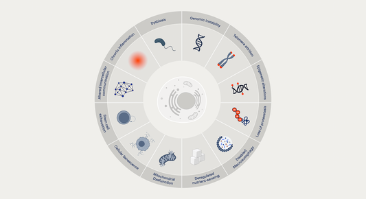 Discover the 12 Hallmarks of Aging and how ingredients like NAD+ precursors, senolytics, and other targeted compounds address these hallmarks to support healthy aging.