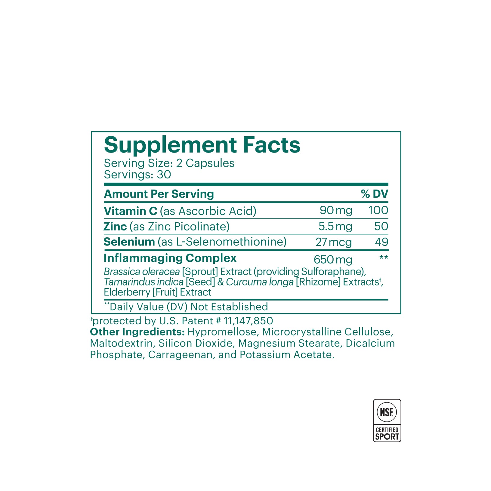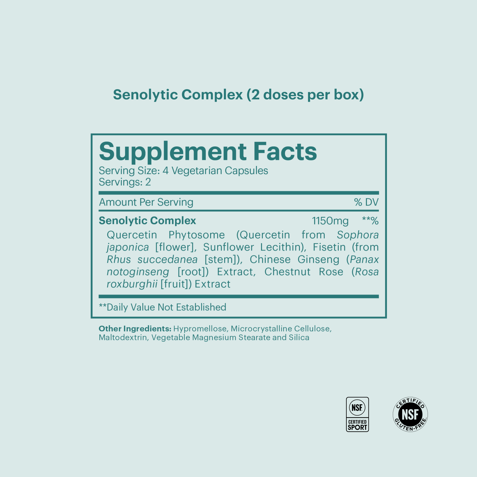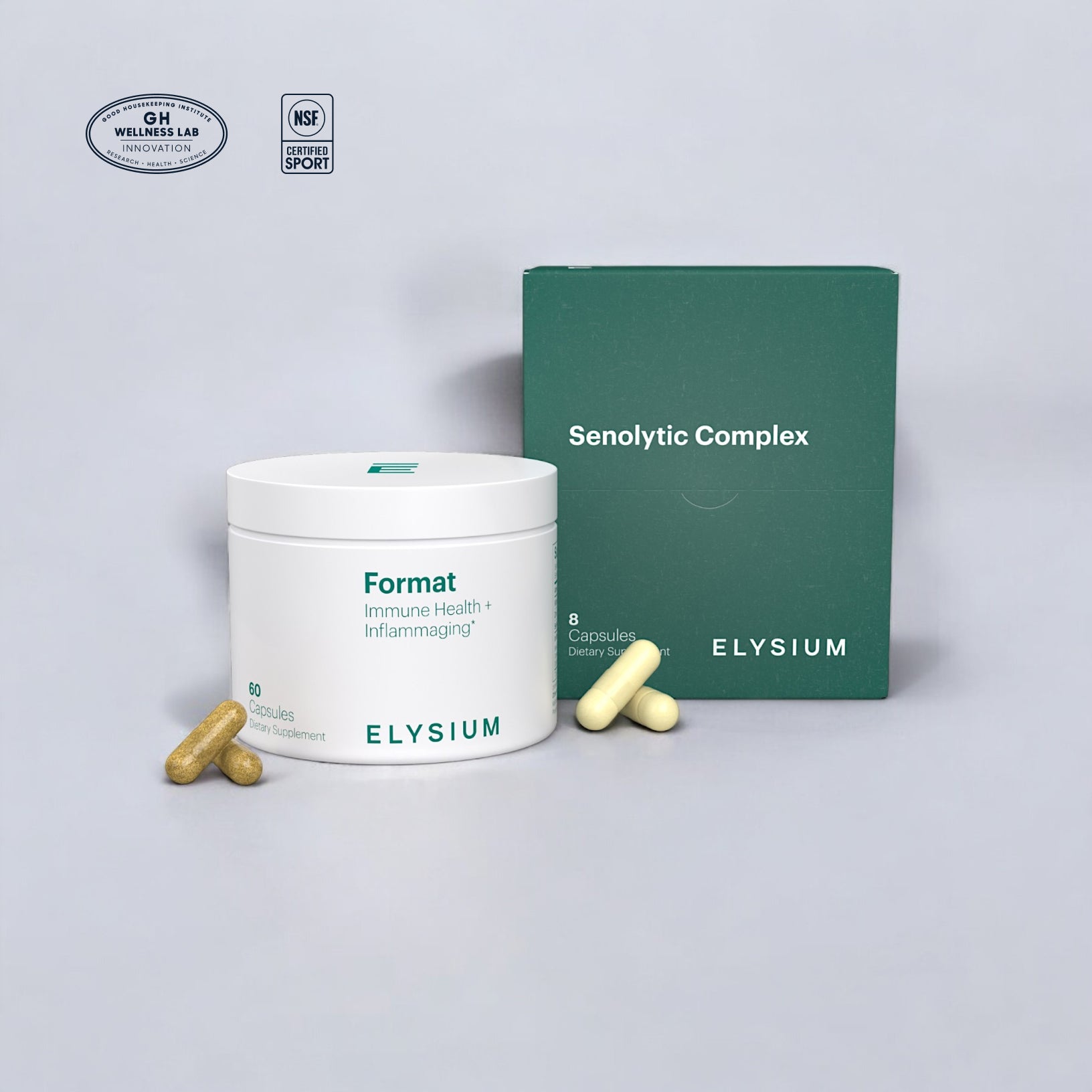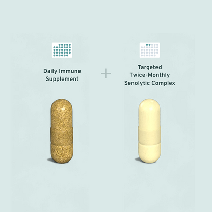 Format is unique in combining a daily immunomodulatory cocktail with intermittent, proven senolytic compounds to clear senescent cells—not available in any other health supplement.