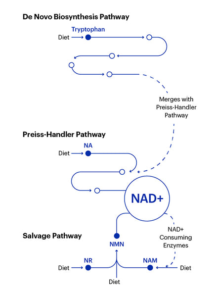 Once you do consume something with an NAD+ precursor in it, be it through diet or supplementation, it works its way through the body on one of the pathways.
