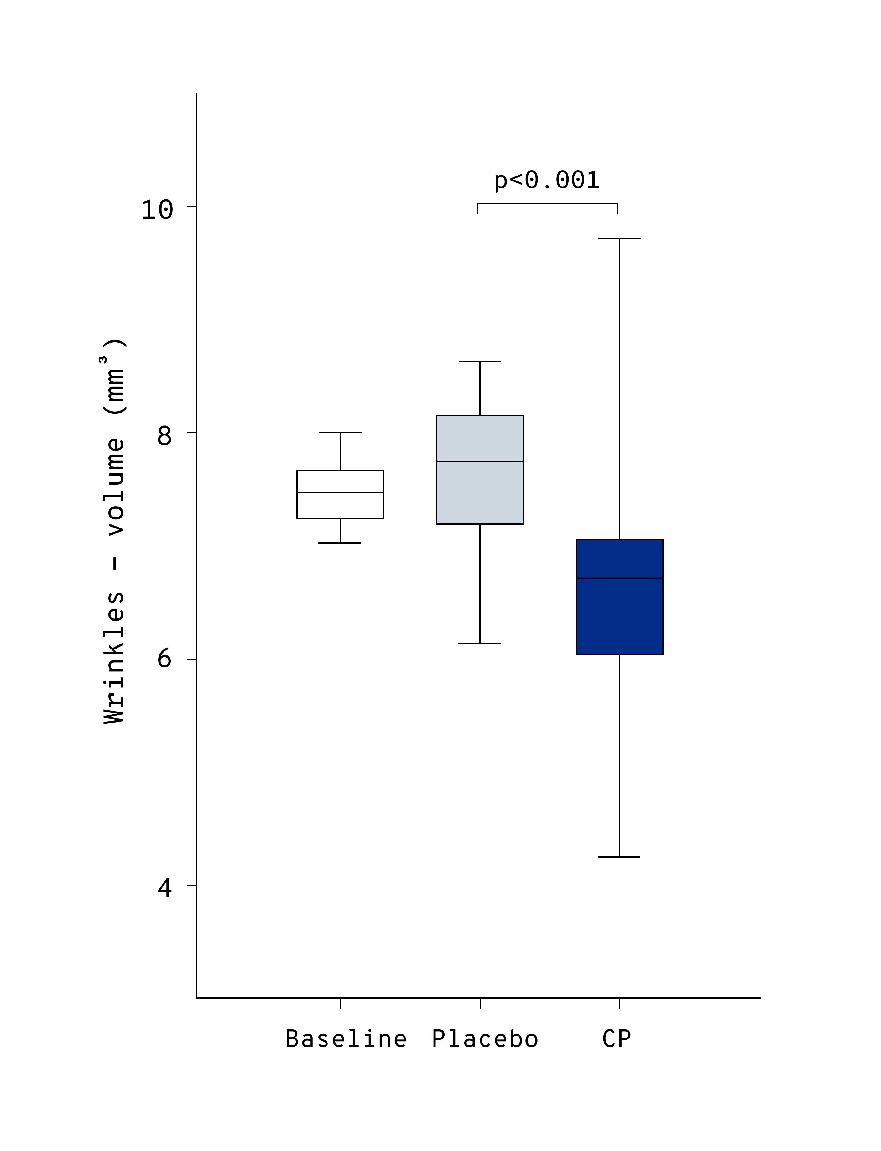 Chart: Reduction in the average wrinkle volume after 16 weeks of supplementation with collagen peptides (CP). Figure adapted from Zmitek, et al., 2024.