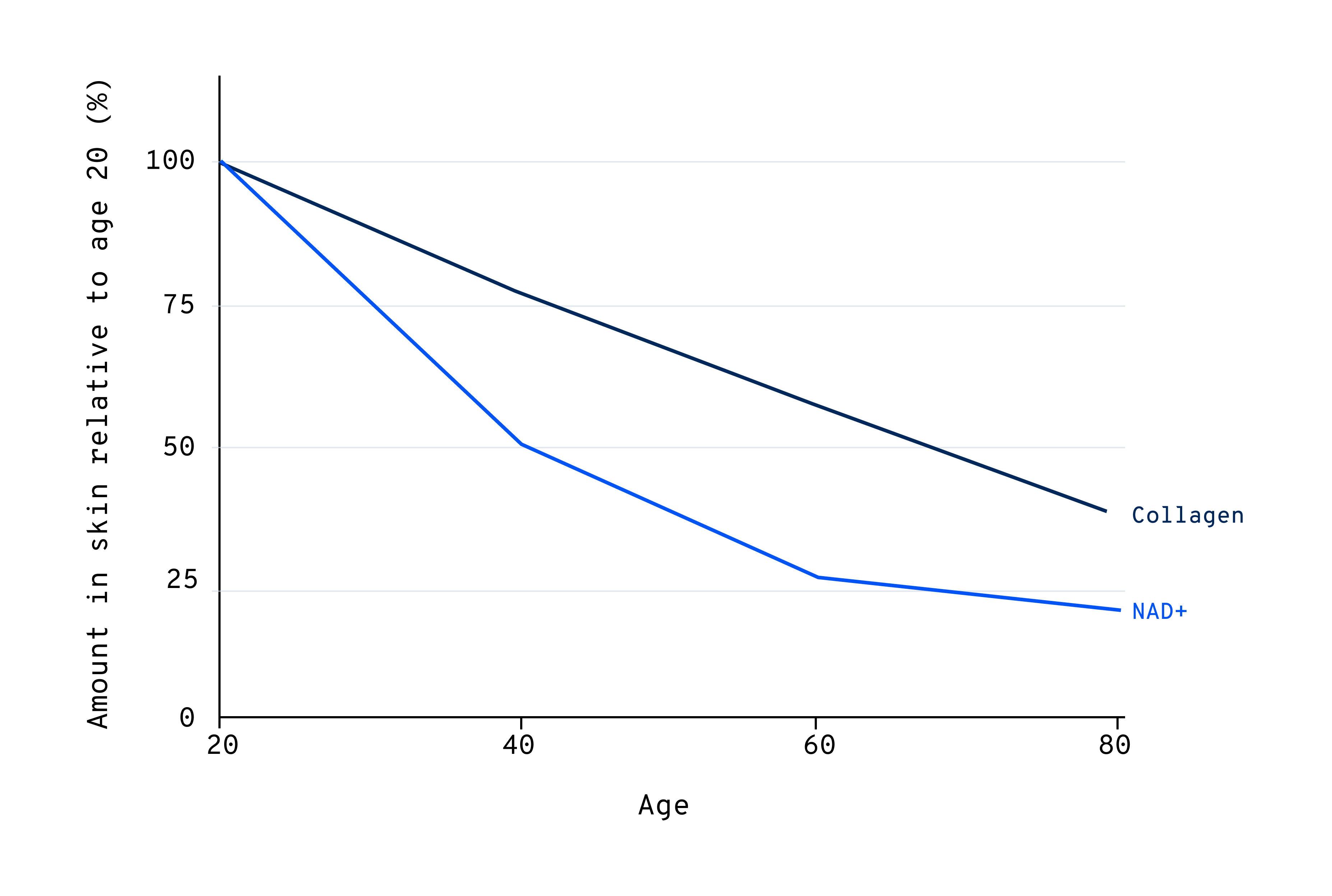 Chart: NAD+ and collagen levels relative to their amount at age 20 (expressed as % values). Sources: Shuster, S. et al., Br J Dermatol. 1975;93(6):639-643, Massudi, H. et al., PLoS One. 2012;7(7):e42357.