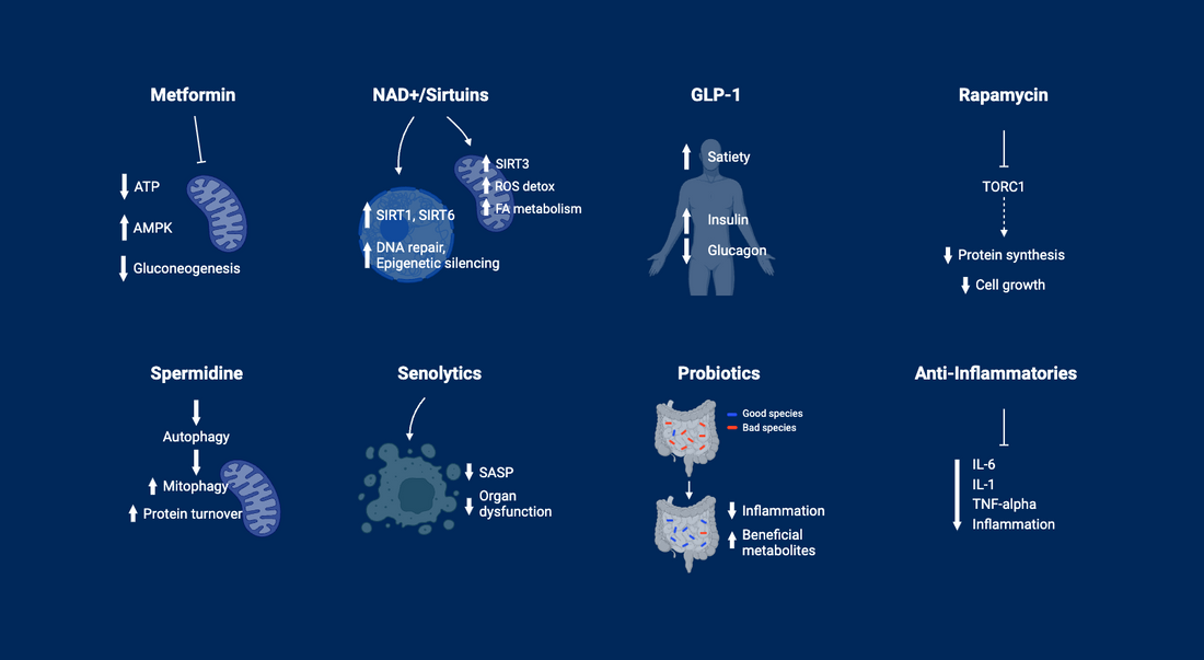 *Image above adapted from Guarente et al., Human trials exploring anti-aging medicines, Cell Metabolism (2023)